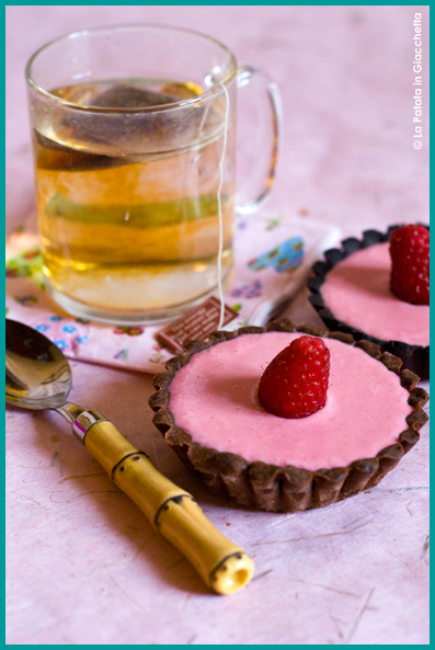 Ho scelto un dolcetto scenografico, in formato monoporzione. Per i sapori invece ho deciso di assecondare il gusto di Brontolo che ama tutti i dolci al cioccolato e i lamponi. Per cui ho recuperato la mia frolla al cioccolato, e ho variato la ricetta della mousse alle fragole, sostituendole con i lamponi.